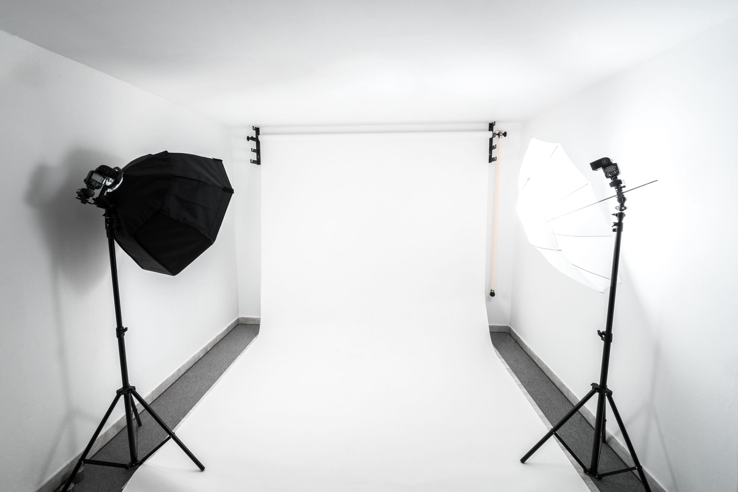 Paint walls a neutral colour — white or light grey is ideal. White walls serve as additional light sources when you bounce studio lights off them, giving you soft fill light without additional equipment.